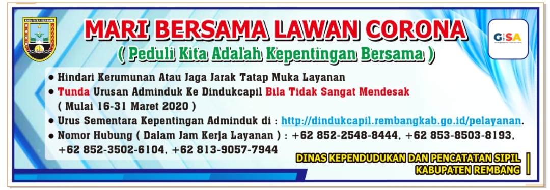 Pelayanan Kependudukan Online 22 Mar 2020 By sysadmin Pemkab Rembang | Rembang | Pemerintahan 1 min read Share this Post PENYEMPROTAN DISINFEKTAN OLEH BPBD KAB REMBANG DALAM RANGKA PENCEGAHAN COVID 19 DIKECAMATAN LASEM PERSIAPAN LOMBA PESTA SIAGA